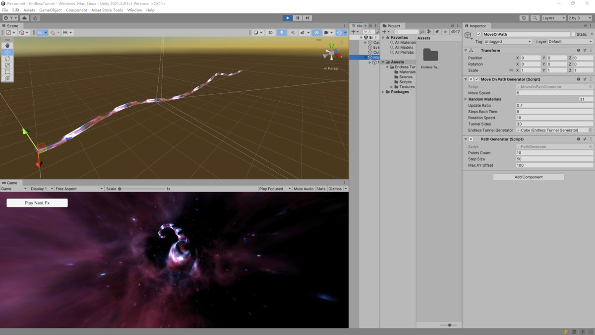 Endless Tunnel Game Toolkit is a comprehensive Unity package designed for developers, featuring a path randomization script, List<Vector3> automatic channel generation script, 800+ Tile or Noise textures, and 30 example channel effects. With these resources, you can create infinite lengths and varieties of tunnel effects for your projects. Additionally, if there is significant interest from users, further updates may include particle effects within channels, random prefab generation within channels, additional channel path functions, and integration with Cinemachine for custom paths.