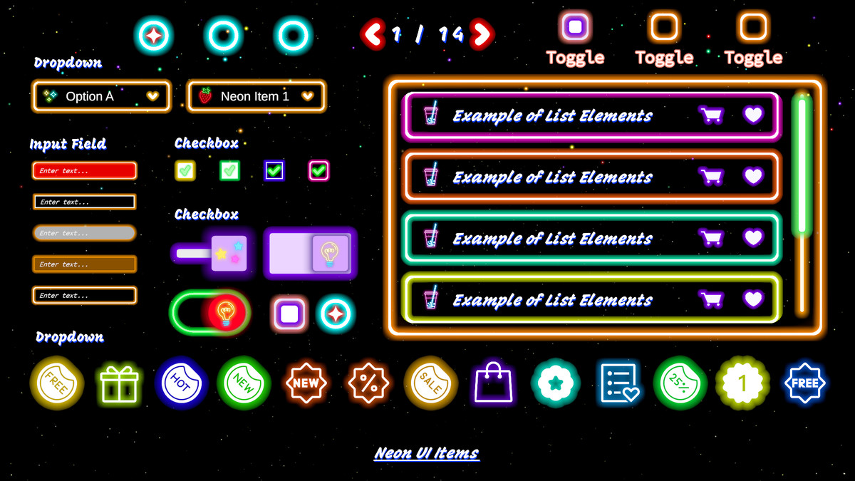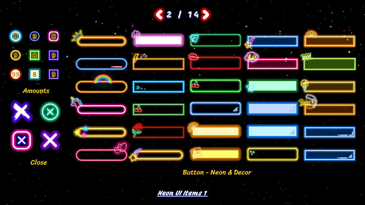 is a versatile UI component pack that delivers stylish, neon-themed buttons, frames, and icons—perfect for adding a vibrant, futuristic aesthetic to your project. All components can be used for both UI layout and as 2D sprites (no sample scenes included). This pack also includes every icon from the 6680 Icons Neon & Flat & Glowpackage, providing you with an extensive selection of neon-styled icons to enhance any design.